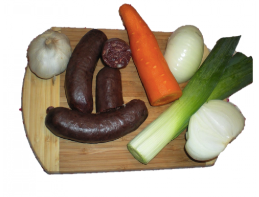 Ingrédients : Tête, gorge, jarret, cœur, langue et sang de porc, oignons, ail, sel, poivre, boyaux de porc.
